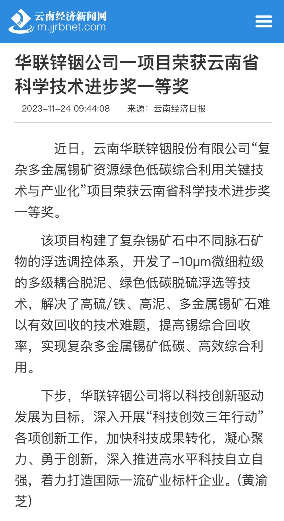 云南經(jīng)濟(jì)日?qǐng)?bào):華聯(lián)鋅銦公司一項(xiàng)目榮獲云南省科學(xué)技術(shù)進(jìn)步獎(jiǎng)一等獎(jiǎng)